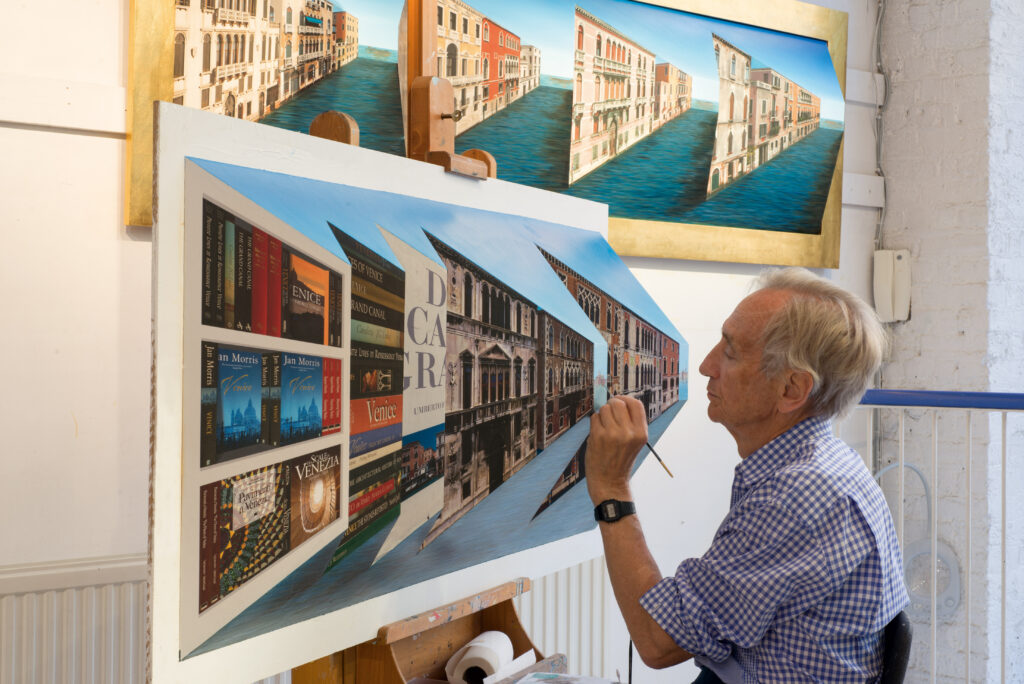 In seinem Londonder Atelier erschafft Patrick Hughes seine Reverspektiven – seine neuesten Arbeiten sind vom 31. Januar bis zum 12. April im Rahmen der Sonderausstellung „The Perspective Paradox“ im explorhino Science Center in Aalen zu sehen. (Quelle: Patrick Hughes)